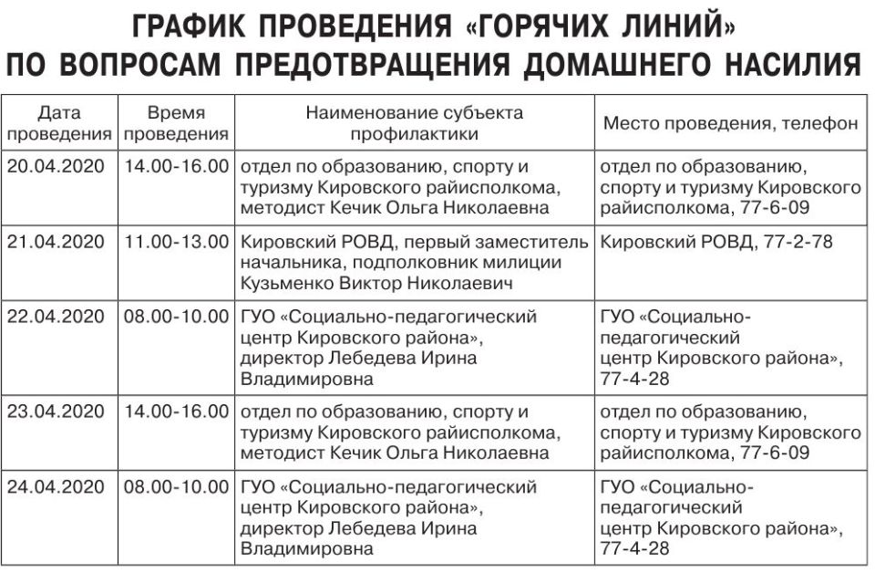Если Вам известно о фактах домашнего насилия просим сообщать в адрес ГУО «Социально-педагогический центр Кировского района» по телефону: 77-4-28, адрес...