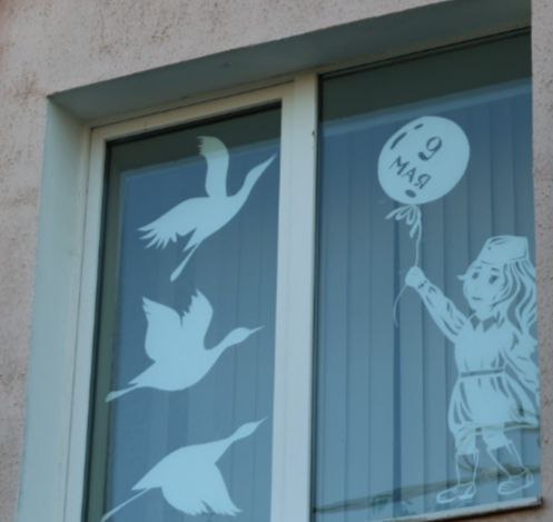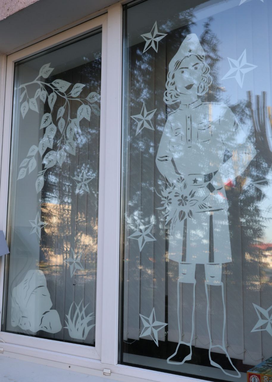 Каждый рисунок, каждая надпись на окне помогают создать праздничную атмосферу значимого события в истории нашей страны — Победы.