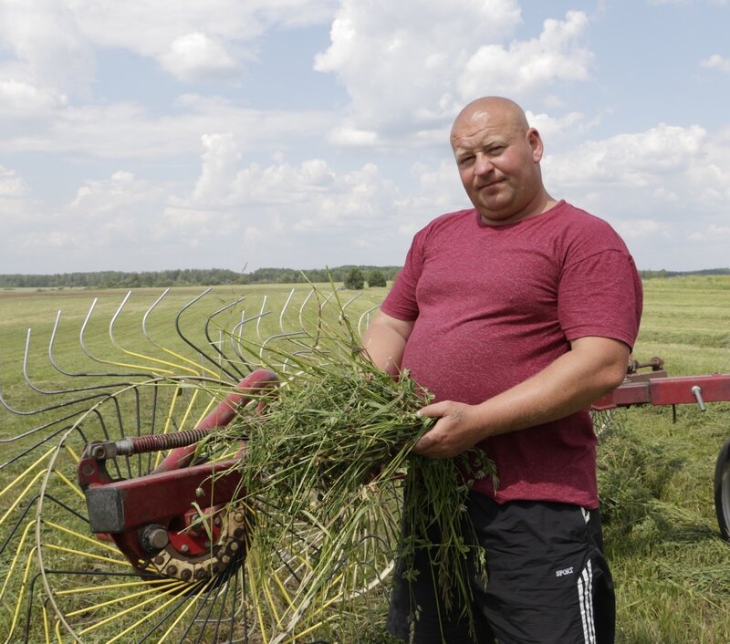 Неўзабаве па гэтых радках праходзіла другая тэхніка — гэта Іван Лазаковіч на “Беларусу” з граблямі ГВП-8,5 падварушваў траву і фарміраваў пышныя валкі, у якіх пад сонцам і ветрыкам маса хутка правяльваецца. Вось тут галоўнае — не ўпусціць момант, каб яна не перасохла, бо прызначана для сенажу.