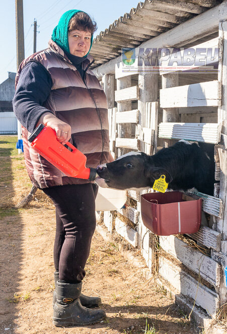 Гучным мычаннем сустракалі сваю карміцельку – Алену Волас – цяляты ад нараджэння і да 21-дзённага ўзросту. Калі журналісты зайшлі ў памяшканне, жанчына якраз паіла іх малаком з соскі.