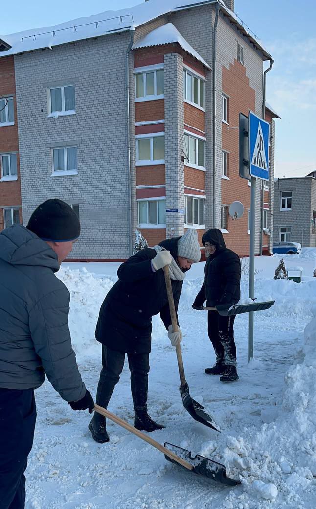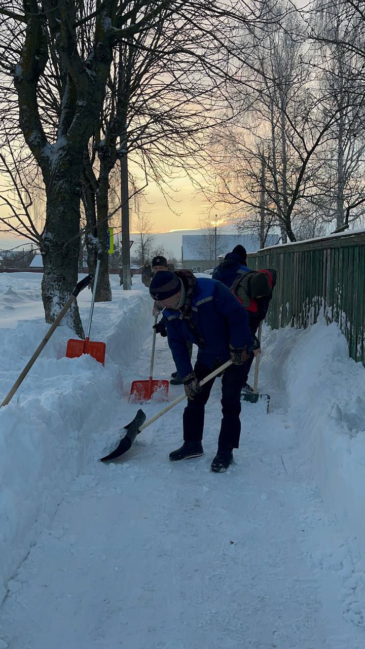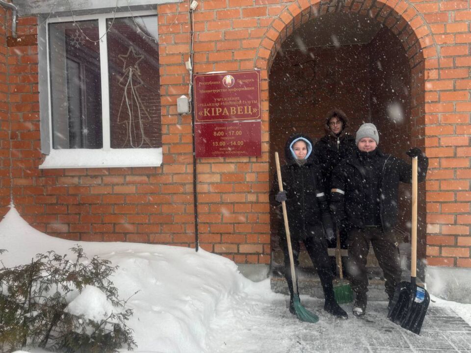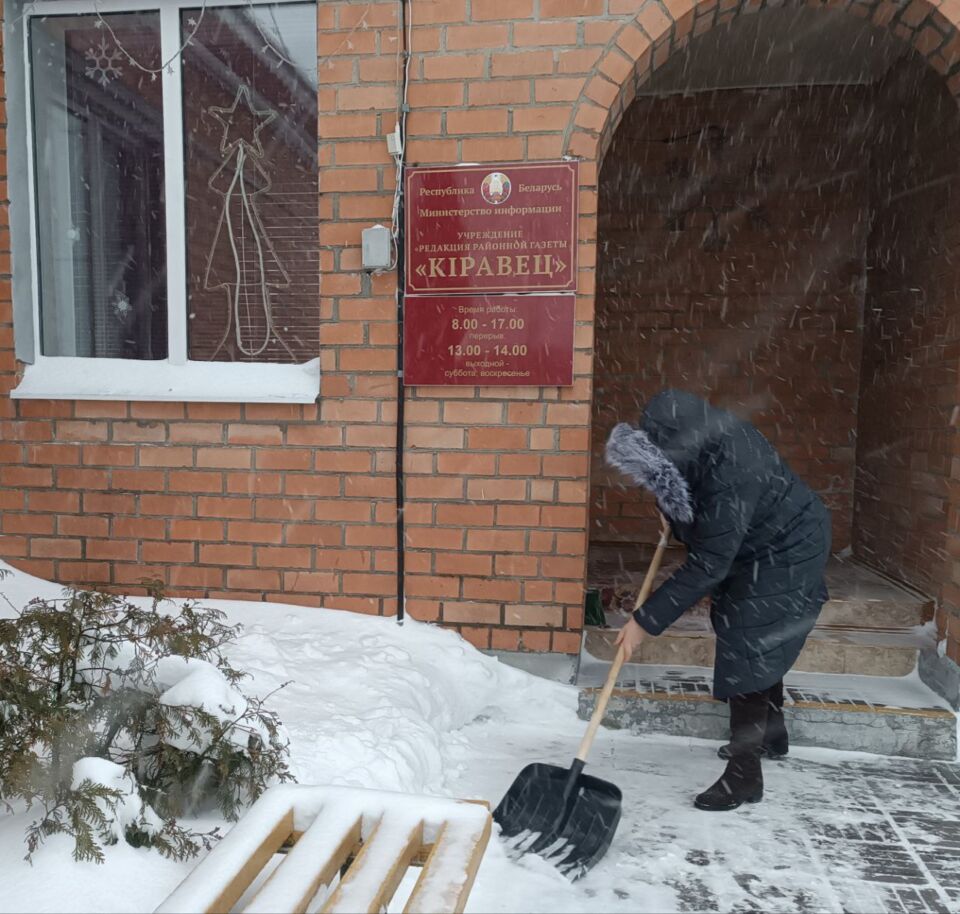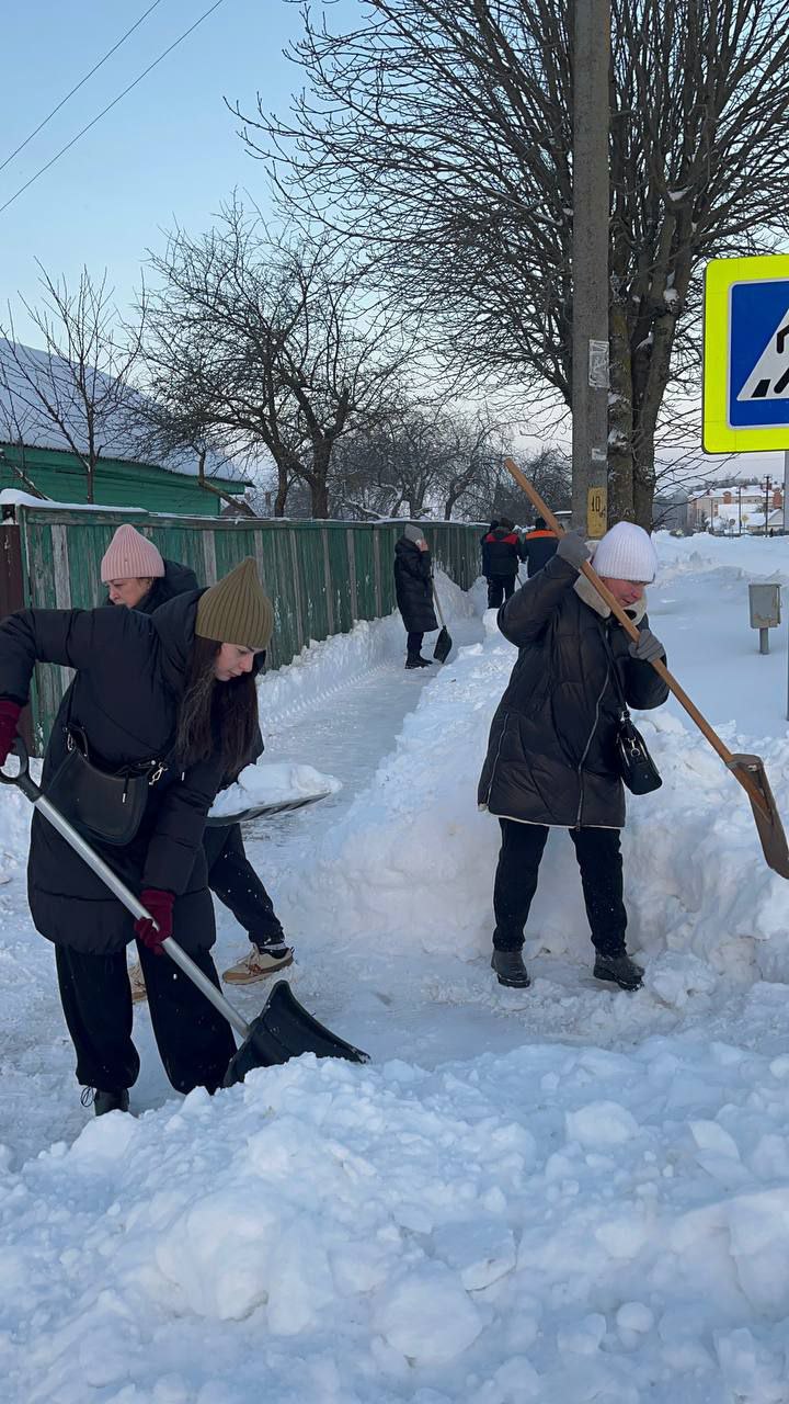 Работники, работающая молодёжь, в том числе молодые специалисты районной газеты «Кіравец» присоединились к челленджу по уборке снега: оказали помощь коммунальной службе по очистке тротуара по улице Пушкинской райцентра.