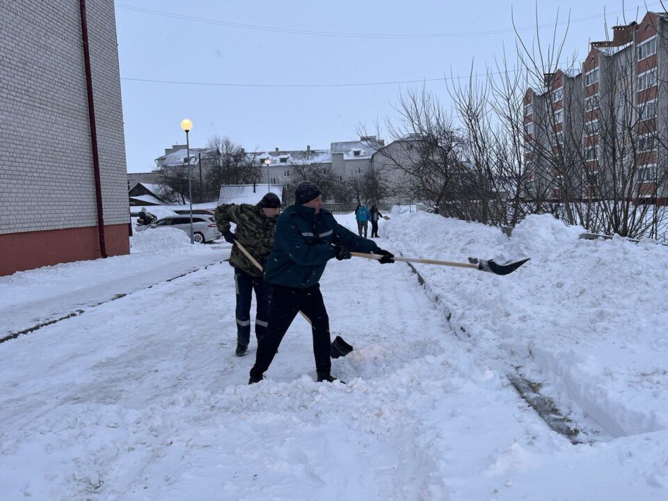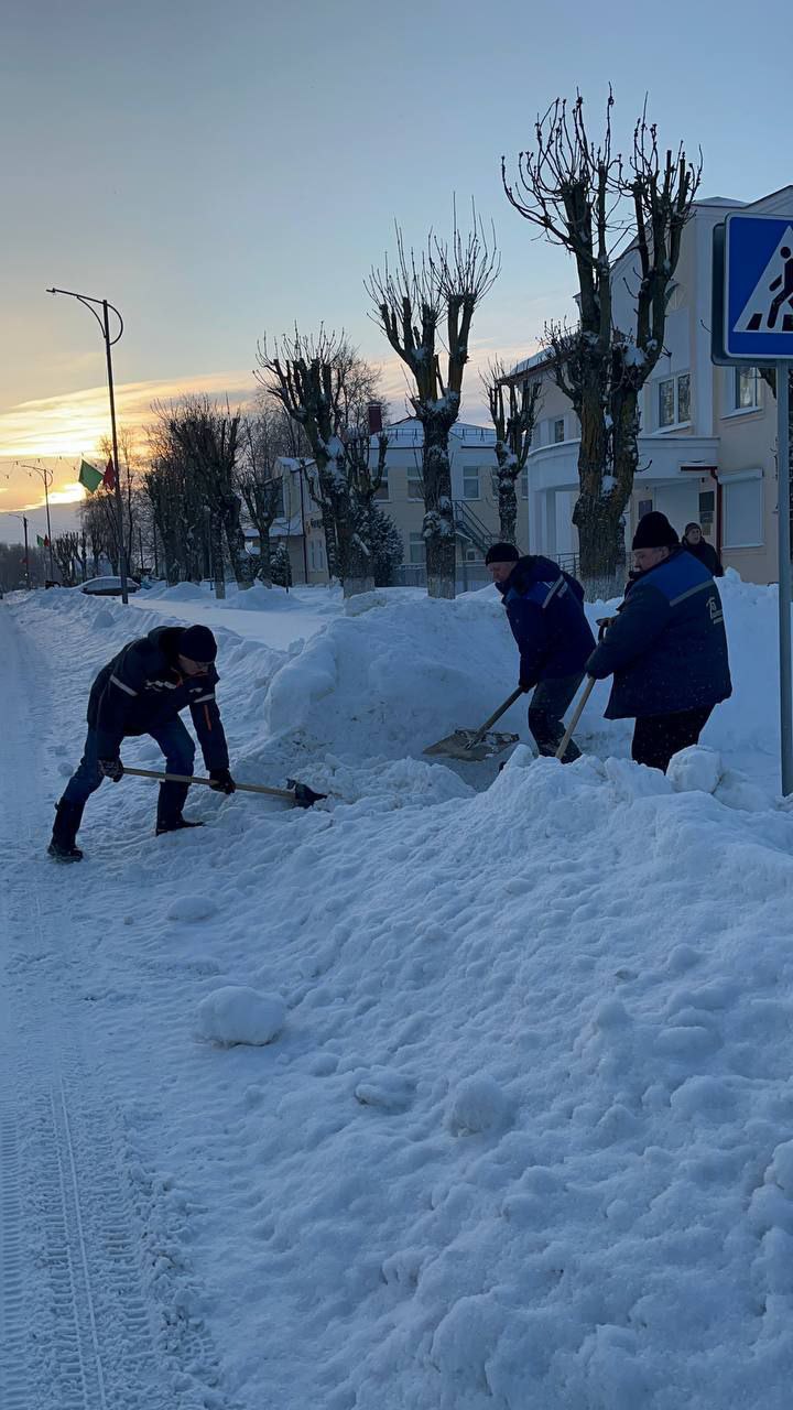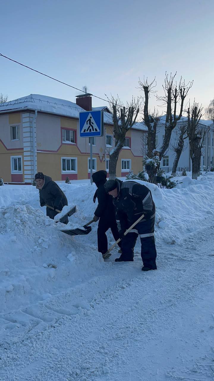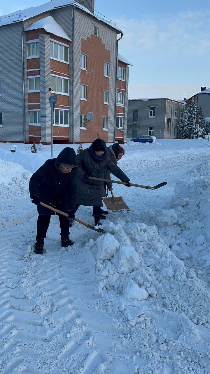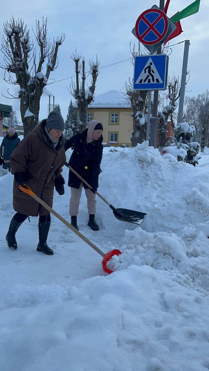 Работники, работающая молодёжь, в том числе молодые специалисты районной газеты «Кіравец» присоединились к челленджу по уборке снега: оказали помощь коммунальной службе по очистке тротуара по улице Пушкинской райцентра.