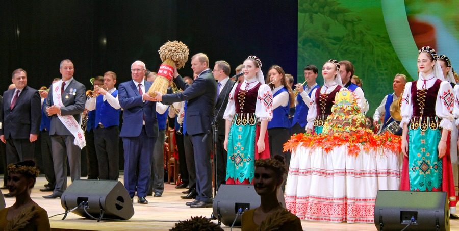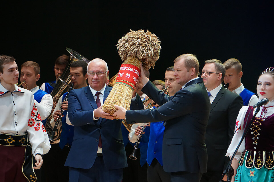 Уладзімір Даманеўскі прыняў рапарт аб завяршэнні на Магілёўшчыне асноўных сельскагаспадарчых работ. Шчырымі апладысментамі прысутныя сустрэлі вялікі духмяны каравай вобласці як сімвал сабранага земляробамі ўраджаю. Яшчэ адзін сімвал — залацісты сноп уручыў губернатару вобласці старшыня Магілёўскага абласнога Аграпрамысловага Саюза, дырэктар ААТ “Рассвет імя К.П.Арлоўскага” Аляксандр Багель.