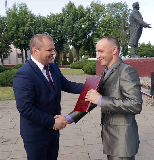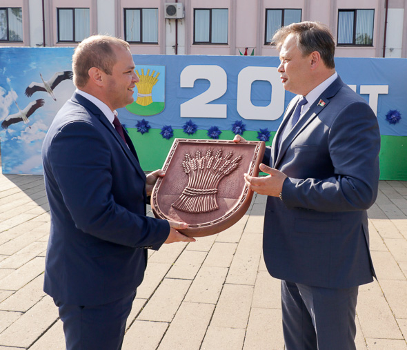 Присутствующих поздравил с 20-летним юбилеем города депутат Палаты представителей Национального собрания Республики Беларусь Владимир Гацко и вручил Михаилу Гулому памятный сувенир в виде керамического герба Кировского района.