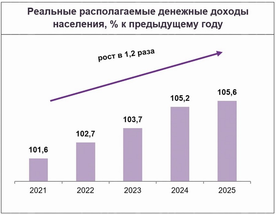 увеличение реальных располагаемых денежных доходов населения за пятилетие в 1,2 раза, включая рост пенсионного обеспечения выше уровня инфляции.
