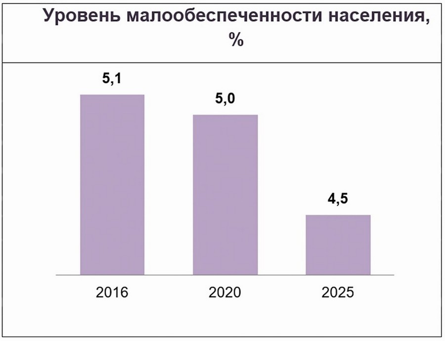 Доля населения с доходами ниже бюджета прожиточного минимума (уровень малообеспеченности) к 2025 году составит не более 4,5 процента.