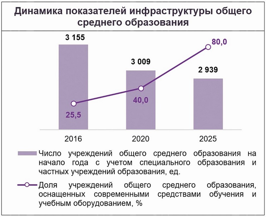 Намечено построить более 50 учреждений общего среднего образования. Не менее 80 процентов действующих образовательных учреждений будут оснащены современным учебным оборудованием и средствами обучения, в том числе для создания инклюзивной образовательной среды.