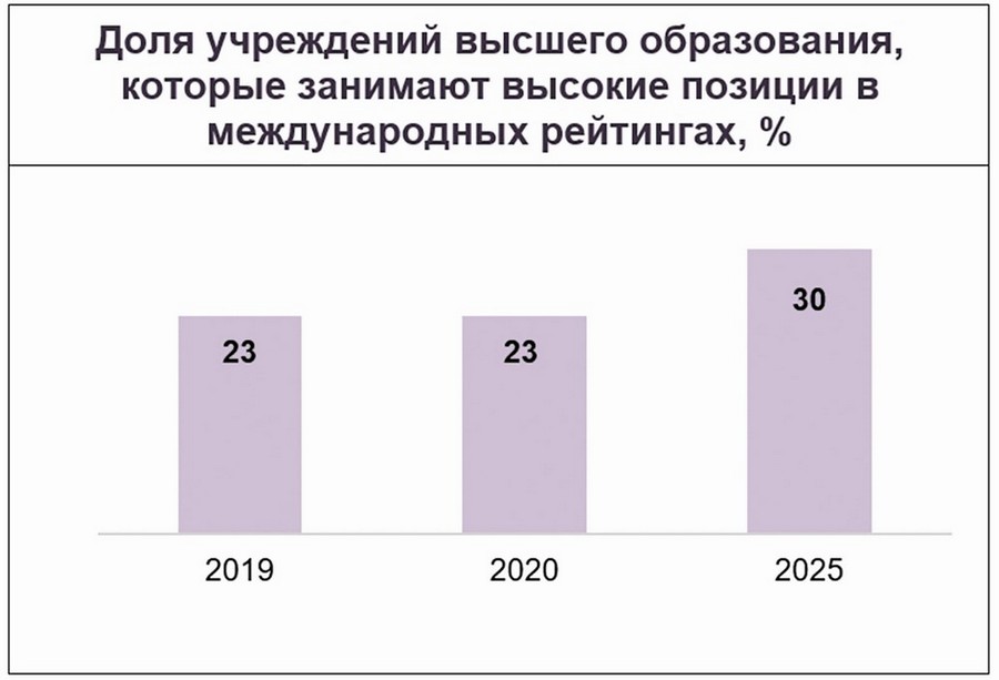 В сфере образования деятельность государства будет нацелена на развитие личностного потенциала подрастающего поколения, обеспечение высокого уровня знаний, формирование навыков и компетенций, в полной мере отвечающих потребностям экономики. Повышение конкурентоспособности образования должно стать опорой для будущего экономического, политического и социально-культурного процветания страны.