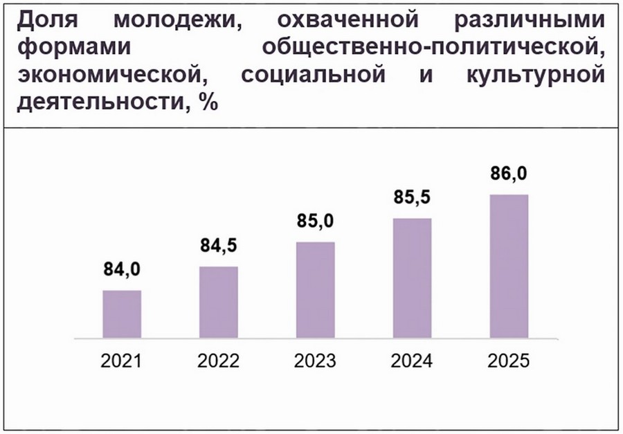 В результате охват молодежи различными формами общественно-политической и социально-экономической деятельности составит 86 процентов.