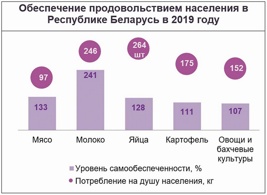 Страна полностью обеспечивает себя продовольствием. Производство сельскохозяйственной продукции на душу населения соответствует уровню развитых стран и по многим позициям превышает показатели, достигнутые в странах ЕС: по мясу — в 1,2 раза, молоку — в 1,7 раза, овощам — в 1,4 раза.