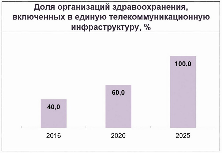 Будет создана единая телекоммуникационная инфраструктура здравоохранения, поэтапно освоены новые методы персонифицированной медицины для повышения результативности лечения с применением информационно-коммуникационных технологий.