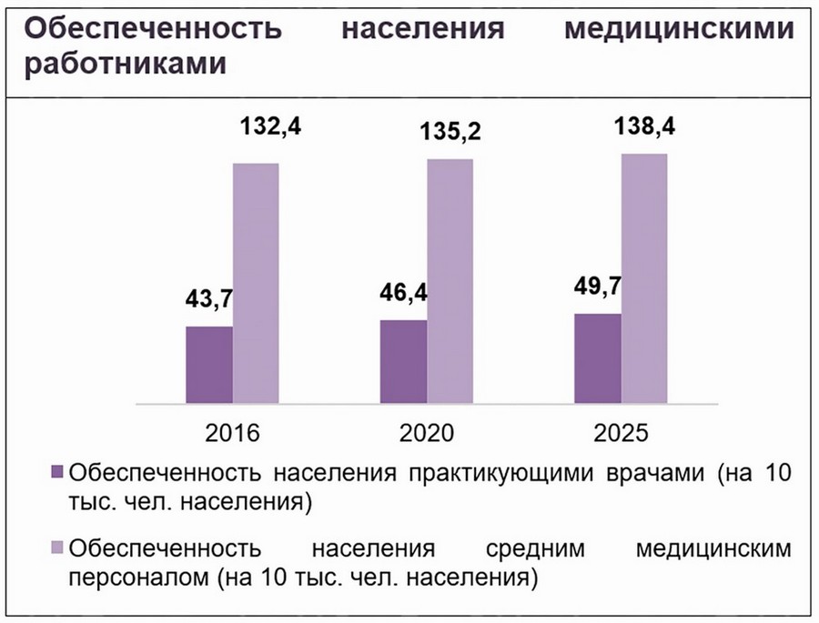 Главным результатом этих мер станет повышение ожидаемой продолжительности жизни населения до 76,5 года. Обеспеченность населения практикующими врачами увеличится с 46 до 49 на 10 тысяч человек населения. Доля медицинских учреждений, включенных в единую телекоммуникационную инфраструктуру здравоохранения, возрастет с 60 процентов в 2020 году до 100 в 2025-м.
