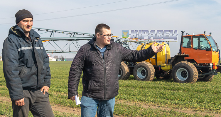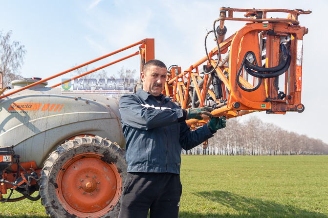 На суседнім полі, бліжэй да аэрадрома, на прычапным апырсквальніку “Jacto advance 3000” падкормліваў таксама азімую пшаніцу бацька Сяргея Міхалапа Аляксандр. Механізатар расказаў, што працуе ў гаспадарцы з 1993 года, а яго сын за штурвалам трактара – 6 год. Абодвум падабаецца іх справа, тым больш, калі працаваць давяраюць на новай тэхніцы, напрыклад, такой, на якой зараз шчыруе яго сын. Пра свой апырсквальнік Аляксандр Віктаравіч расказаў, што шырыня захопу складае 18 метраў — менш, чым у “Тумана”, аднак “Jacto advance 3000” таксама прызначаны для апрацоўкі розных культур на вялікіх плошчах.