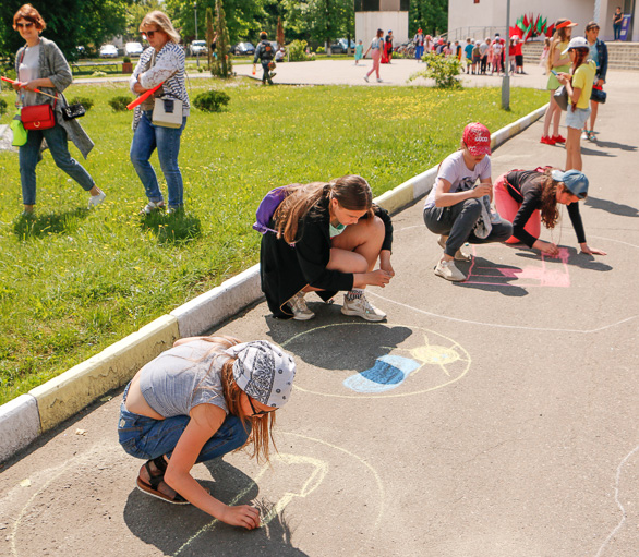 Сегодня, 9 июня, в рамках праздничных мероприятий, посвященных 20-летию города Кировска, на площадке около районного Дома культуры состоялся конкурс рисунков на асфальте под названием «Я рисую город мой», организованный работниками РДК. Активное участие в нем приняли дети разных возрастов. Ребятам было предложено изобразить их самые любимые места в Кировске, свои дома и дворы, друзей – все, что связано с родным городом. По итогам конкурса победу праздновали ученицы СШ №2 им. К.П.Орловского Илона Манько и Ксения Громова девочки изобразили Государственный флаг Республики Беларусь и герб Кировского района. Они и еще многие активные юные художники получили заслуженные призы.