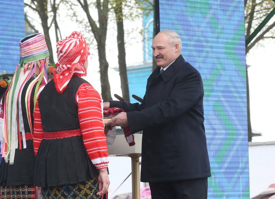 Александр Лукашенко вручили 30-метровый рушник-оберег в честь годовщины аварии на ЧАЭС