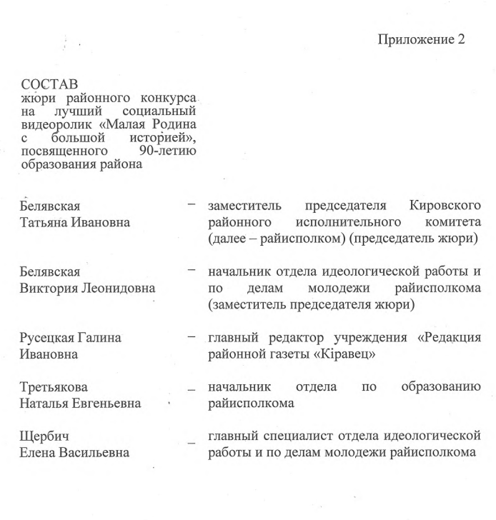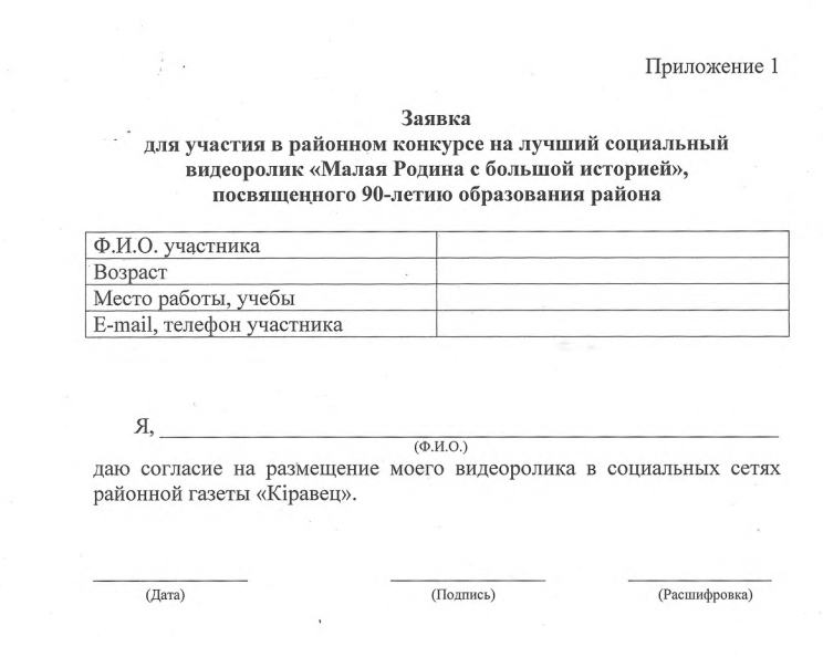 5. Видеоролики необходимо направлять в мессенджер «Телеграмм» на номер +375295463123 с пометкой «Малая Родина с большой историей», либо доставлять на любом носителе в отдел идеологической работы и по делам молодежи райисполкома.