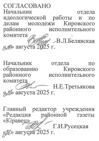 Отдел идеологической работы и по делам молодежи Кировского районного исполнительного комитета (далее — райисполком), отдел по образованию райисполкома, учреждение «Редакция районной газеты «Кіравец».