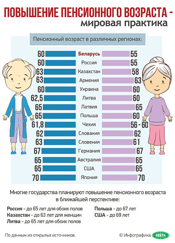 Пенсионный с учетом ожидающейся продолжительности жизни, развития экономики, других факторов возраст в 55 лет для женщин и в 60 лет для мужчин на постсоветском пространстве сохранился только в Беларуси, России и Узбекистане.