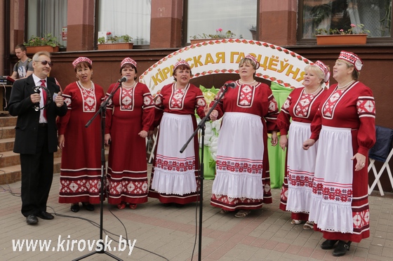 В 17.00 на площадке перед зданием Центра праздничное настроение создавали творческие коллективы с программой «Кіраўская гасцёўня». Здесь также развернулась выставка народного творчества, все желающие могли отведать угощения.
