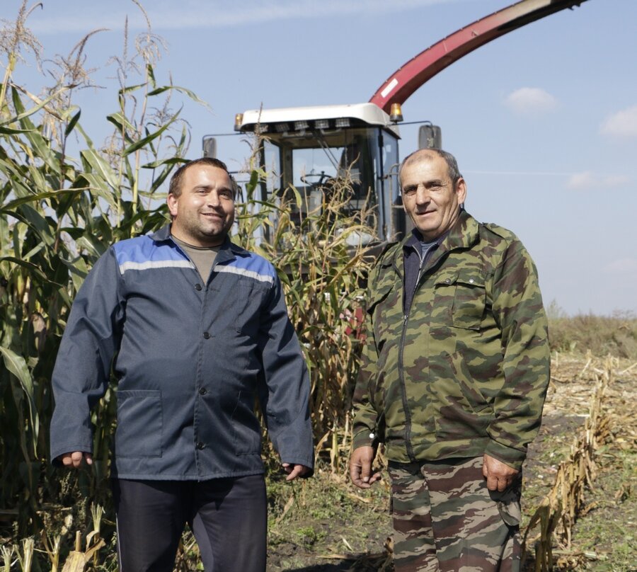 Віталь Бяляўскі і Павел Букаты старанна працуюць на нарыхтоўцы сіласнай кукурузнай масы.