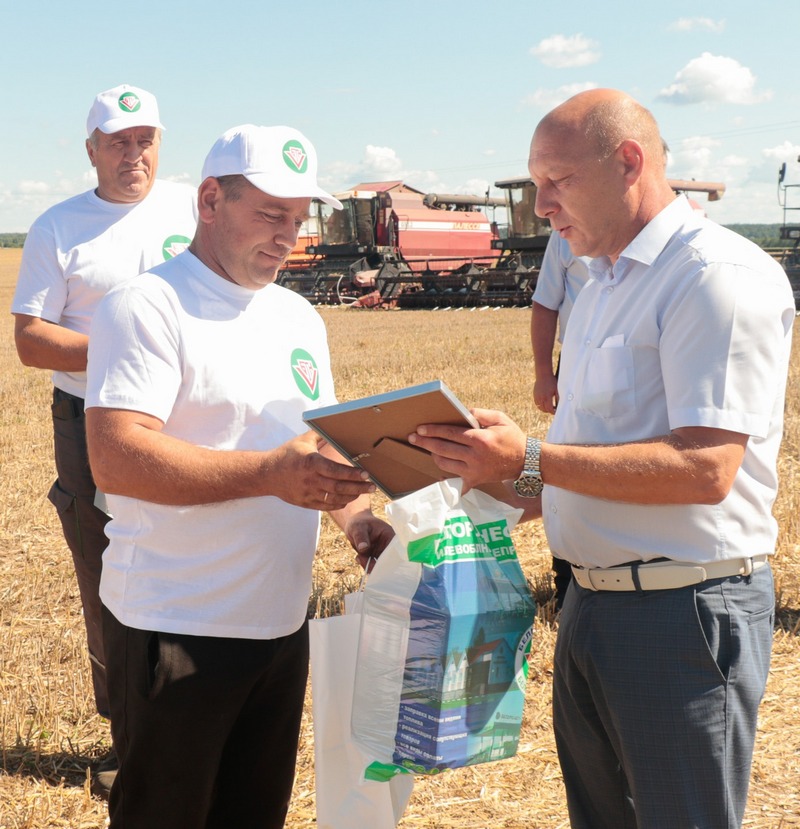Сегодня на поле СХФ «Чигиринка» РУП «Белоруснефть-Могилевоблнефтепродукт» торжественно поздравляли первых тысячников: комбайнера Сергея Фирагина, экипаж зерноуборочного комбайна в составе Анатолия Кузьмина и Сергея Нестерова, водителей Сергея Иванчикова, Александра Кулинича и молодого водителя Артура Маслова.