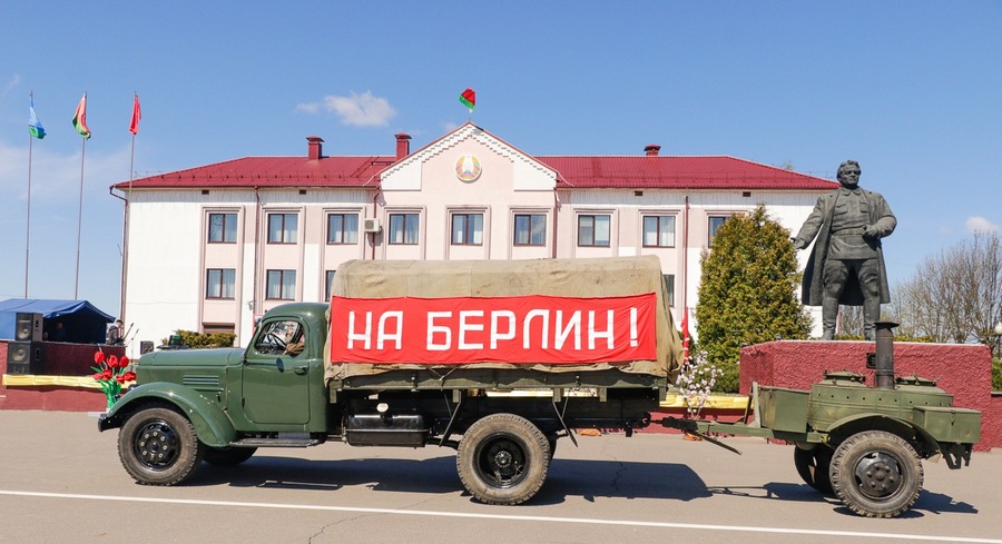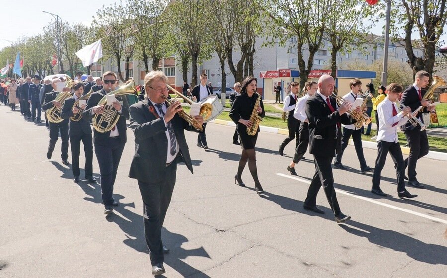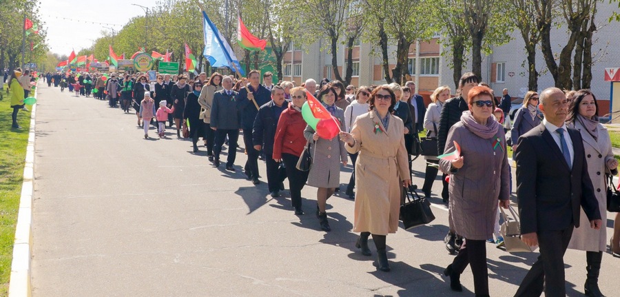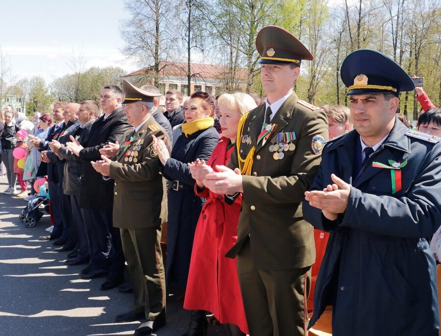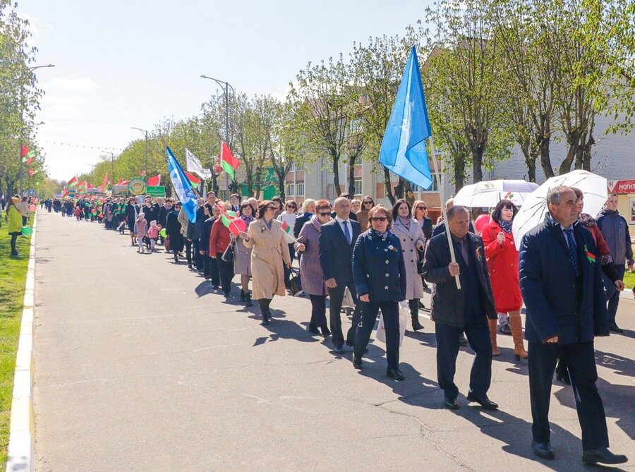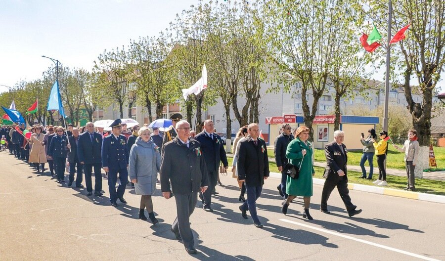 Па вуліцы імя Кірава райцэнтра адбылося святочнае шэсце калон, на чале якога былі воіны тэрміновай службы са Сцягам Перамогі. Пад музыку духавога аркестра “Фанфары Кіраўска” крочылі прадстаўнікі раённай улады, сілавых структур, раённых структур грамадскіх аб’яднанняў, дэлегацыі працоўных калектываў.
