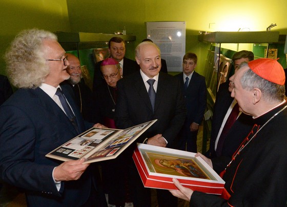 Александр Лукашенко передал в дар музею современную белорусскую икону, а лично кардиналу Пьетро Паролину вручил набор марок на религиозную тематику.