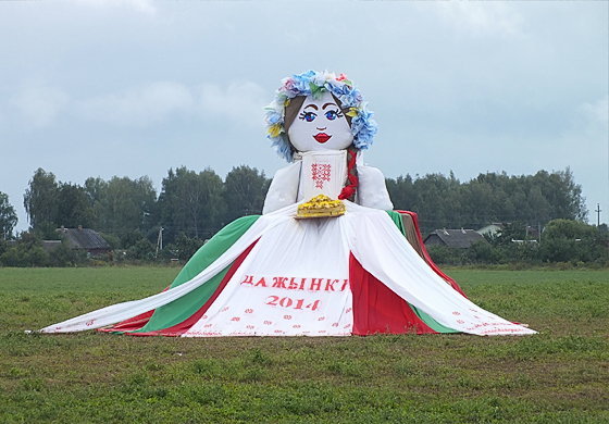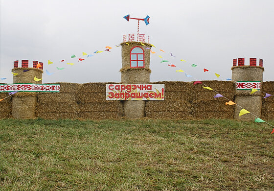 Шыкоўная, са шчырай усмешкай кабета ў нацыянальным адзенні з вялікім караваем запрашае ўсіх прыязджаць на “Дажынкі-2014” — такая кампазіцыя ўпрыгожыла...