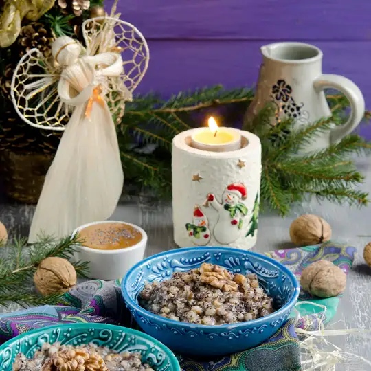 Пшеницу хорошо промыть, залить горячей водой, покрыв зерно, и варить в кастрюле на медленном огне до мягкости, периодически доливая горячую воду. Мак промыть, запарить горячей водой на 23 часа, слить воду, мак растереть, добавить по вкусу сахар, мед, ванильный сахар или любого варенья, покрошенных орехов, изюма, фрукты или ягоды, добавить 1/2 стакана кипяченой воды, все соединить с вареной пшеницей, выложить в керамическую миску и подать на стол в охлажденном состоянии.