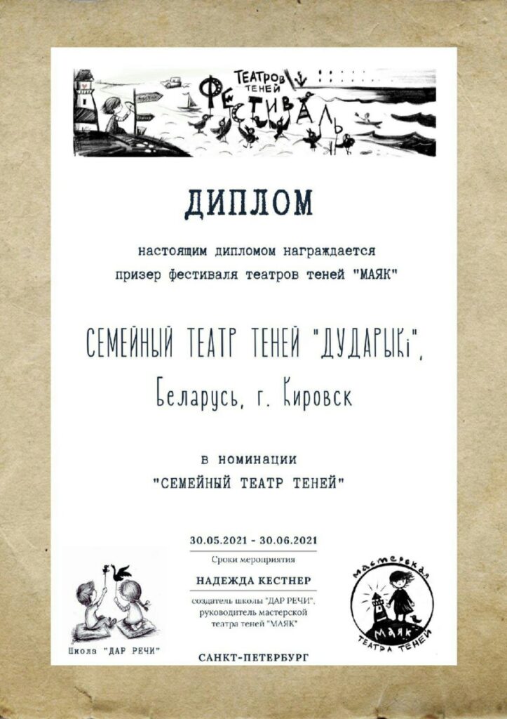 С 30 мая по 30 июня в онлайн-формате проходил фестиваль театров теней «Маяк», организованный Санкт-Петербургской одноименной мастерской театра теней и школой «Дар речи». Участниками стали теневые театры из России и Беларуси. Конкурсная часть была организована по нескольким номинациям: семейный театр теней, детское творчество, «струны души» – для взрослых коллективов.