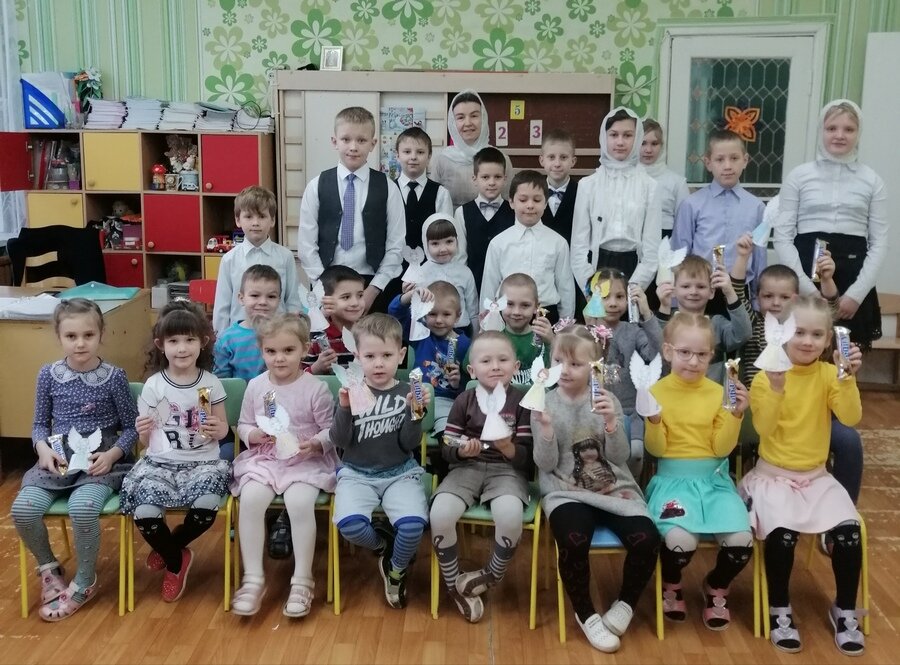 8 января эти же ребята с преподавателем Т.Г.Ильюткиной наведались в ясли-сад №4 г.Кировска к подопечным ребятам, посещающим кружок «Школа православия для детей «Ангелочек». Они устроили для них концерт, поиграли в веселые подвижные игры, порадовали каждого ребенка поделкой-ангелочком и шоколадным батончиком. А в дар учреждению от храма преподнесли столовую посуду.