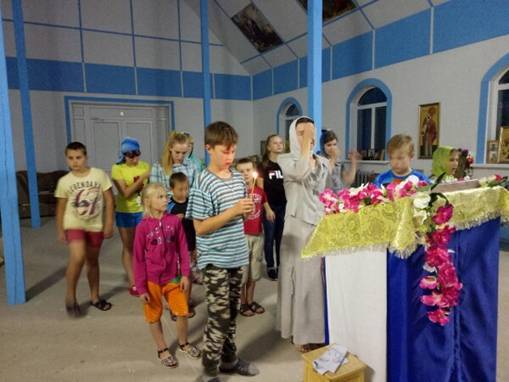 Отрада-3Также помимо участия в традиционных мероприятиях, таких как зарядка, спортивные игры, купание, изготовление поделок из различного материала, конкурсы рисунков, просмотр православных фильмов, настольные игры, ребята проявили свои актерские способности, подготавливая сценку для прощального вечера у костра про свой летних отдых. Каждый день мальчишки и девчонки разучивали православные песни, а в конце смены провели прощальный концерт в местном храме.