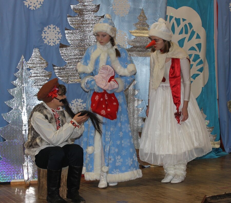 Деда Мороза воплотил на сцене сам режиссер спектакля Сергей Лавриненко, Снегурочку сыграла Ксения Каранькова, Карачуна – Антон Сакадынец, Снежную бабу – Александра Дулепко, Медведя – Виктория Анашкевич, лесных ведьм – Вероника Русанова, Василина Пимошина, Полина Хохлова, Белого волка – Кира Прилепо, волков – Дарья Воронич, Алексей Каранкевич, Анастасия Иванова, Ауку – Артем Степанович, Переплута – Максим Болденко, гномов – Александра Еремеева и Мария Калмыкова. Все проказали себя настоящими артистами, настолько мастерски и убедительно сыграли своих героев.