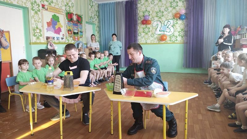 У пап же была другая задача: примерить обмундирование и приготовить салат, который потом им пришлось съесть с закрытыми глазами, а дети помогали кормить их. Итог: родители сыты, дети довольны!