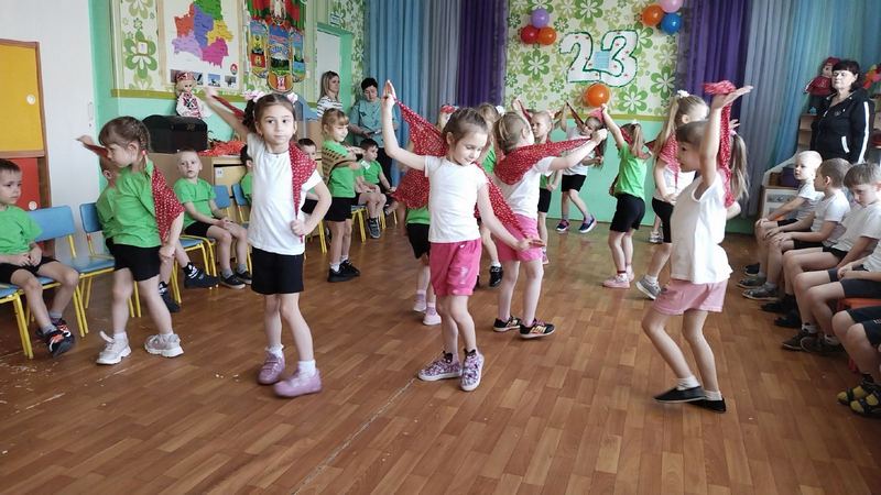 Воспитанники средней и старшей групп соревновались между собой, пели знаменитую «Катюшу», танцевали под песню «Закаты алые» и читали стихи о разных родах войск и героизме и смелости солдат.