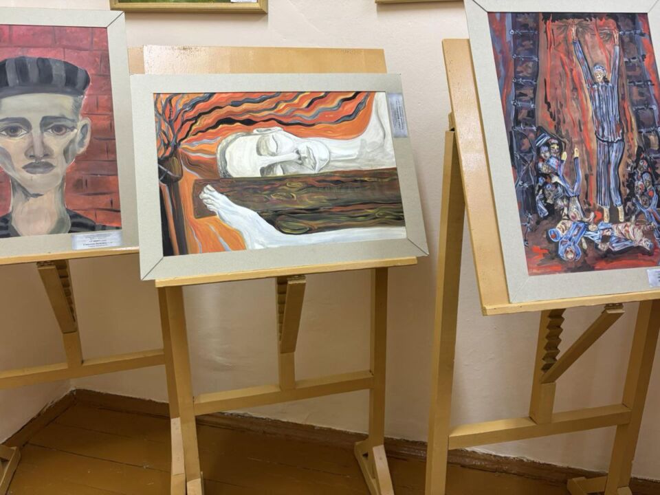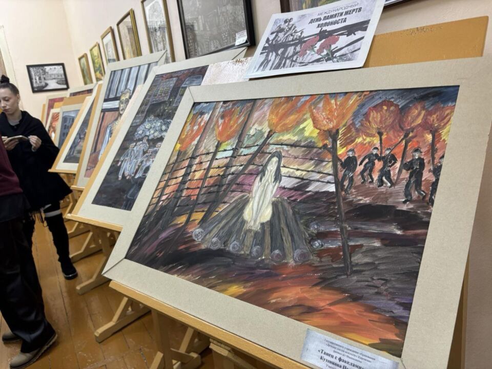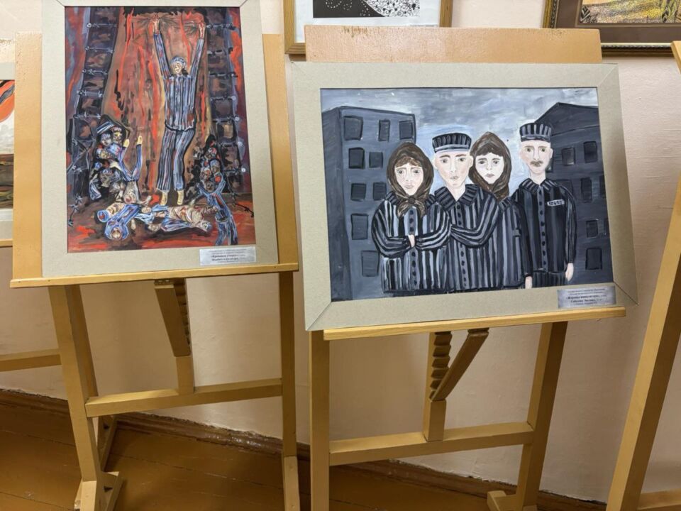 Беседу сопровождала выставка работ учащихся «Ужасы войны глазами детей», что данная на основе работ Михаила Савицкого «Лічбы на сэрцы».