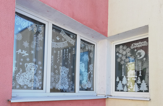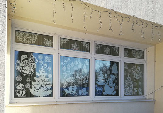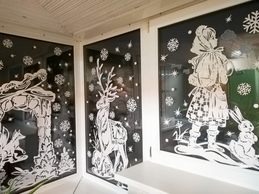 Особое внимание работники яслей-сада  уделили украшению окон, которые  оформлены в технике вытынанки. Окна радуют глаз новогодними композициями из бумаги,  где главными персонажами в созданных оконных композициях стали  Снеговики и Елочки, Дед Мороз и символ года – Тигр. При включенном свете ажурные фигурки выглядят просто волшебно.