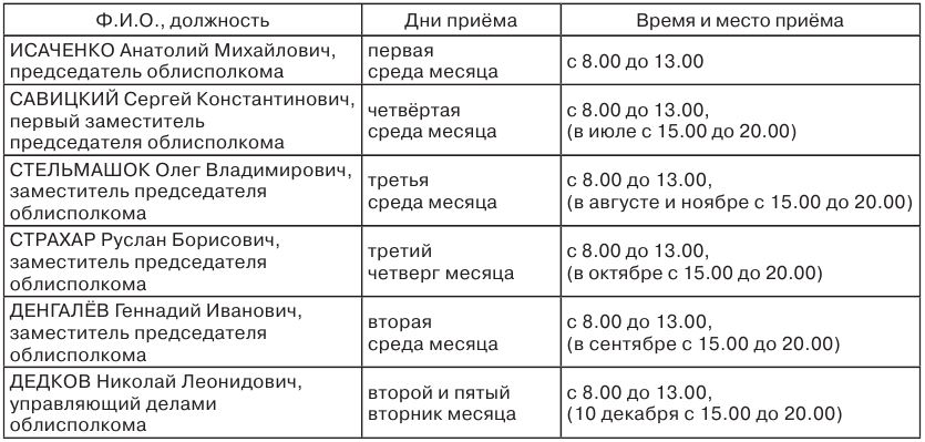 ГРАФИК личных приёмов граждан, их представителей, представителей юридических лиц руководством облисполкома на второе полугодие 2024 года