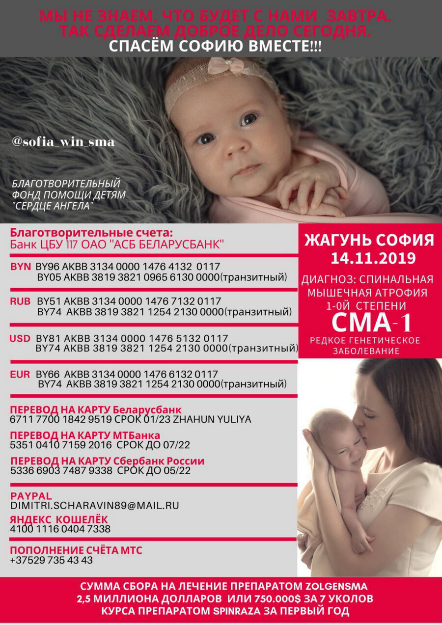 Мы обращаемся к  Вам с огромной просьбой о помощи в сборе средств для лечения нашей дочери Жагунь Софии Евгеньевны.