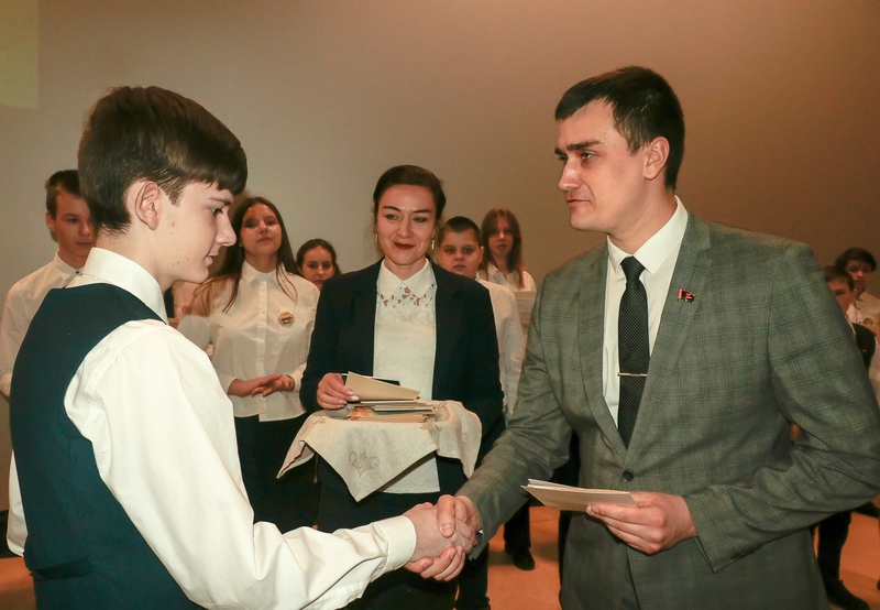 В дополнение к главному документу гражданина Республики Беларусь первый заместитель председателя – начальник управления по сельскому хозяйству и продовольствию райисполкома Александр Киселёв вручил ребятам Государственный флаг и издание «Конституция Республики Беларусь».