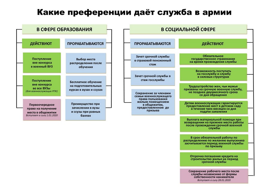 В настоящий момент Минобороны инициирован ряд социальных гарантий для военнослужащих, прошедших срочную службу. Большинство из них — в сфере образования.