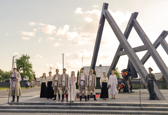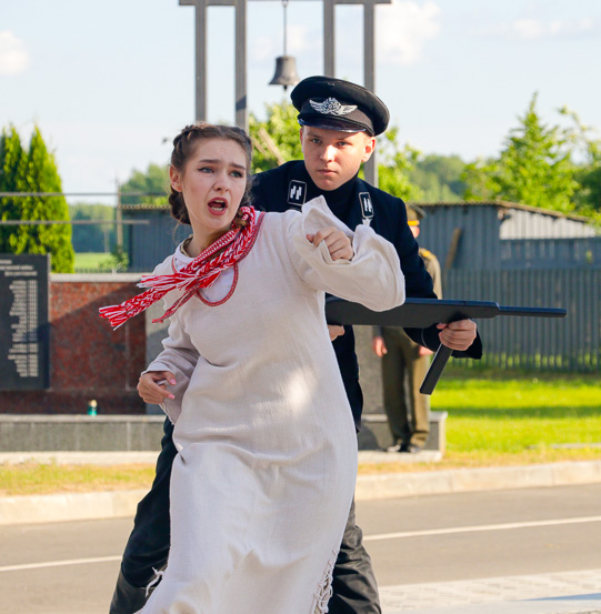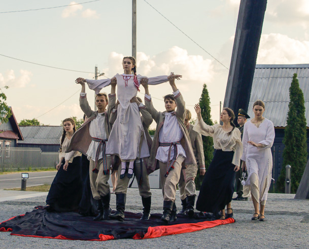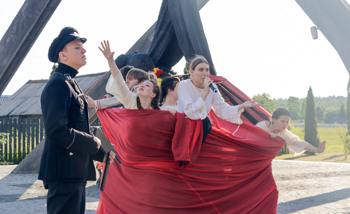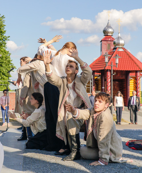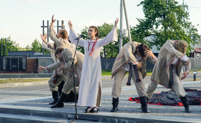 На фоне скульптурной композиции «Беларусь – Скорбящая мать» учащиеся Могилевского государственного колледжа искусств показали литературно-пластическую композицию по поэме «Марыйка» Алеся Казеко, в которой нашли свое воплощение эпизоды борковской трагедии.