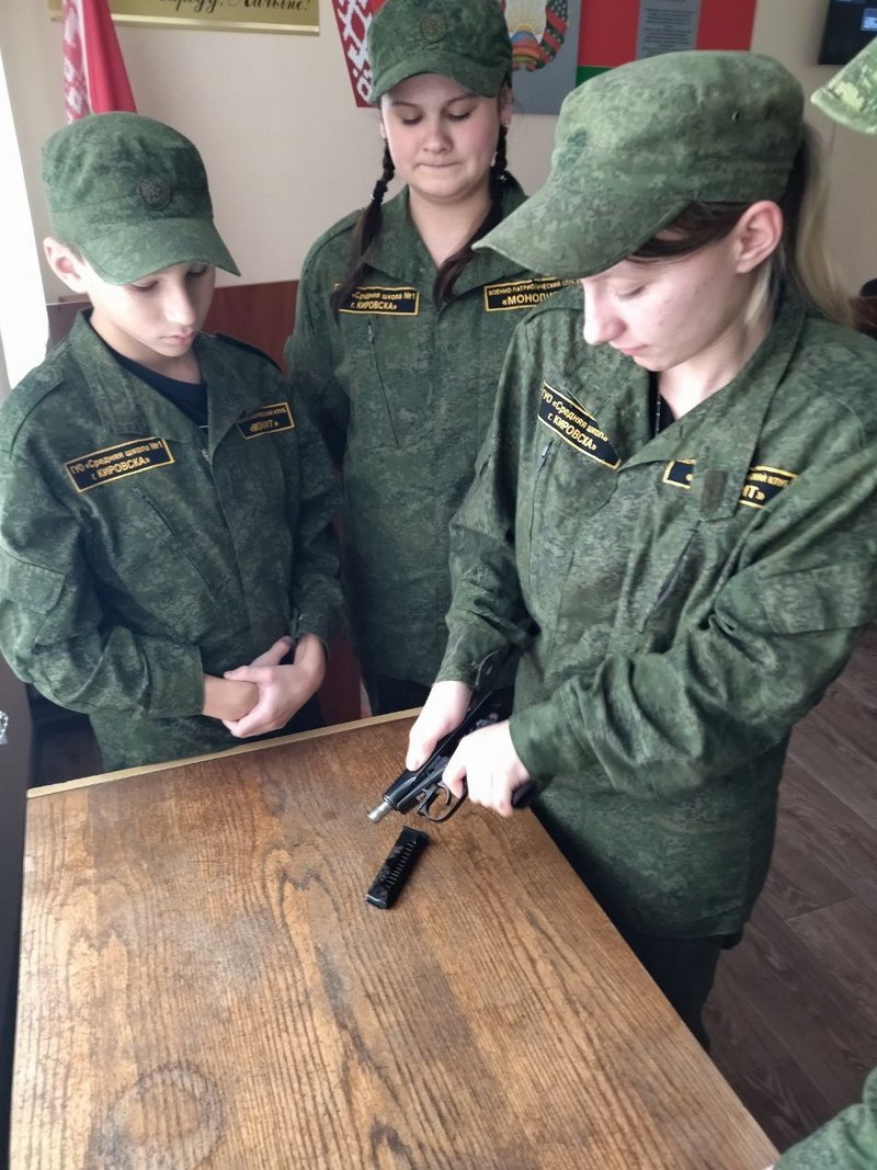 Юноши и девушки посмотрели видеоролик об академии милиции, примерили форму сотрудников, ознакомились с вооружением – автоматом «Сайга» и пистолетом Макарова. Ребята даже попробовали свои силы в разборке и сборке пистолета Макарова.