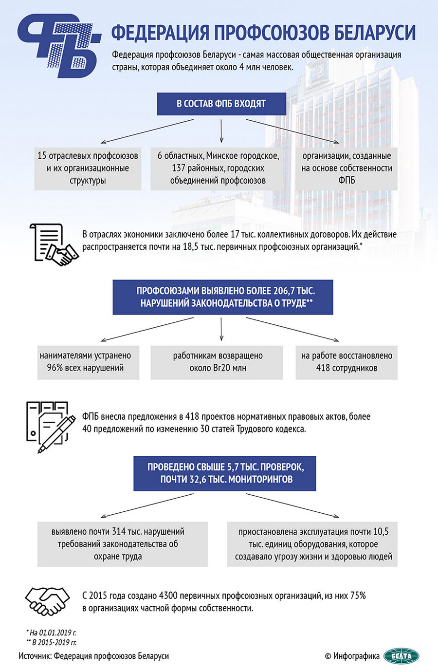 Федерация профсоюзов недавно выступила с несколькими инициативами. Предлагается, в частности, совершенствование системы антикризисного управления на предприятиях и по выплате заработной платы предприятиями-банкротами. По этим вопросам председатель ФПБ уже докладывал главе государства.