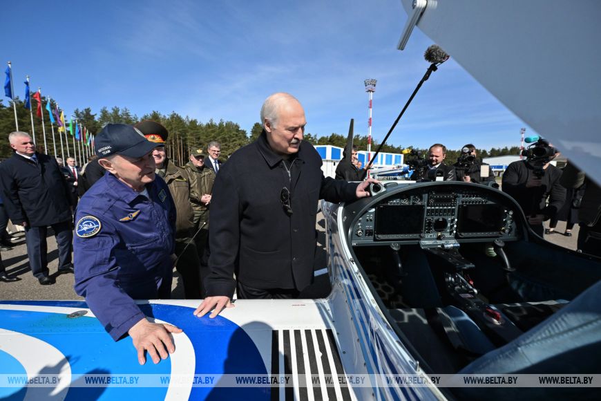 Президент во время пребывания в аэроклубе ДОСААФ посетил павильон «Космос», где представлены в том числе личные вещи белорусских космонавтов и Юрия Гагарина. Особенно заинтересовал Александра Лукашенко спускаемый аппарат космического корабля «Союз». В музее есть личные вещи и части экипировки космонавтов Олега Новицкого и Марины Василевской.