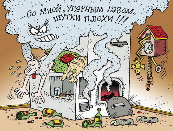 А для того, чтобы не получить отравление угарным газом, помните, что нельзя преждевременно закрывать заслонку печей (пока угли полностью не прогорят). Не используйте для отопления помещений газовые бытовые приборы и аппараты (например, газовые плиты). Открытое пламя выжигает кислород в помещении, и его становится недостаточно для нормальной работы горелок. Из-за недостатка кислорода газ сгорает не полностью — образуется угарный газ. Нахождение в помещении, воздух которого содержит 0,2% угарного газа, в течение 1 часа вредно для здоровья, а при содержании 0,5% угарного газа находиться в помещении в течение 5 минут опасно для жизни. Нельзя пользоваться газовым оборудованием или другими теплогенерирующими агрегатами и устройствами при неисправных дымоходах и вентиляционных каналах.