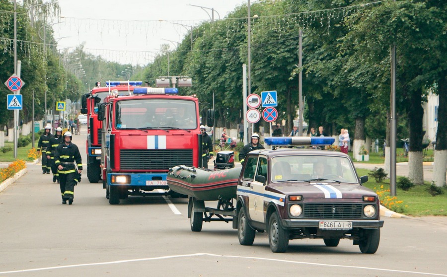 Пачалося ўрачыстае шэсце супрацоўнікаў РАНС і парад пажарна-выратавальнай тэхнікі ад вуліцы Гагарына. Апладысментамі сустракалі кіраўчане і госці горада аўтамабілі з мігалкамі і гукавым суправаджэннем, якія рухаліся па вул.Кірава да плошчы, дзе і разгарнулася галоўнае святочнае дзейства.
