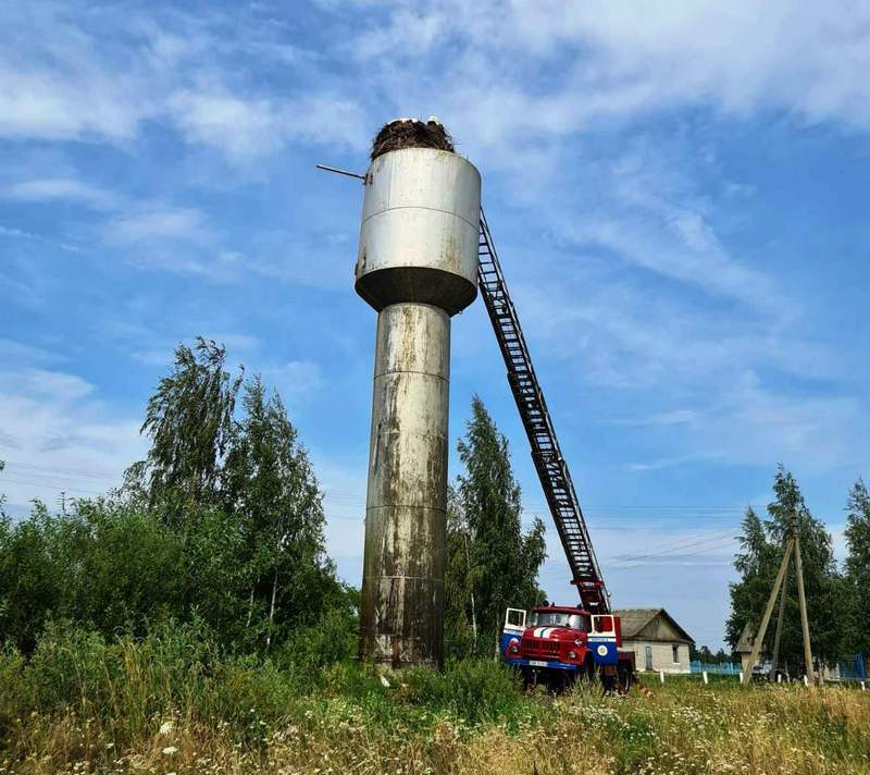 В дежурную службу Кировского районного отдела по чрезвычайным ситуациям в минувший вторник поступило необычное сообщение о том, что необходимо оказать помочь запутавшемуся в гнезде аисту, который самостоятельно не может освободиться из веревки на водонапорной башне в аг.Скриплица Кировского района на территории механизированного двора.