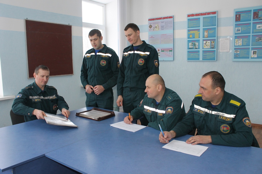 начальнік каравула Сяргей Зносак і прадстаўнікі дзяжурнай змены – вадзіцель Сяргей Еўдакімаў, старшы пажарны Аляксандр Храмовіч, камандзір аддзялення Алег Прусянкоў і вадзіцель Яўген Еўдакімаў