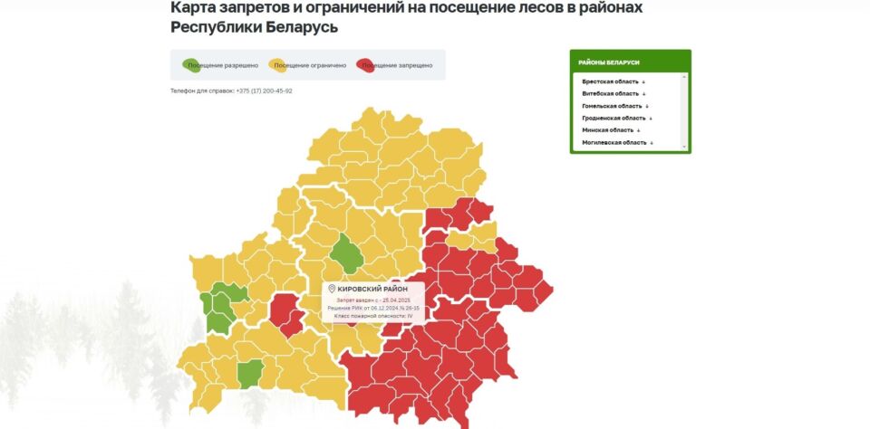 Информация о введении мер ограничительного характера публикуется на официальном сайте Министерства лесного хозяйства в разделе «Карта запретов и ограничений на посещение лесов» (https://www.mlh.by/maps/map.php), и в средствах массовой информации. Также информацию можно уточнить в местных районных исполнительных комитетах и лесохозяйственных учреждениях.
